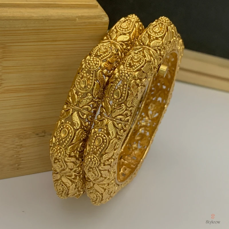 এই বালায় কোনো রঙিন পাথর নেই — সম্পূর্ণ আকর্ষণ তৈরি হয়েছে paisley relief, granular beading এবং open filigree-র পারস্পরিক interplay থেকে। উষ্ণ সোনালি রঙ পুরো নকশার গভীরতাকে আরও দৃশ্যমান করে তুলেছে। বালাটি জোড়ায় (pair) আসে।